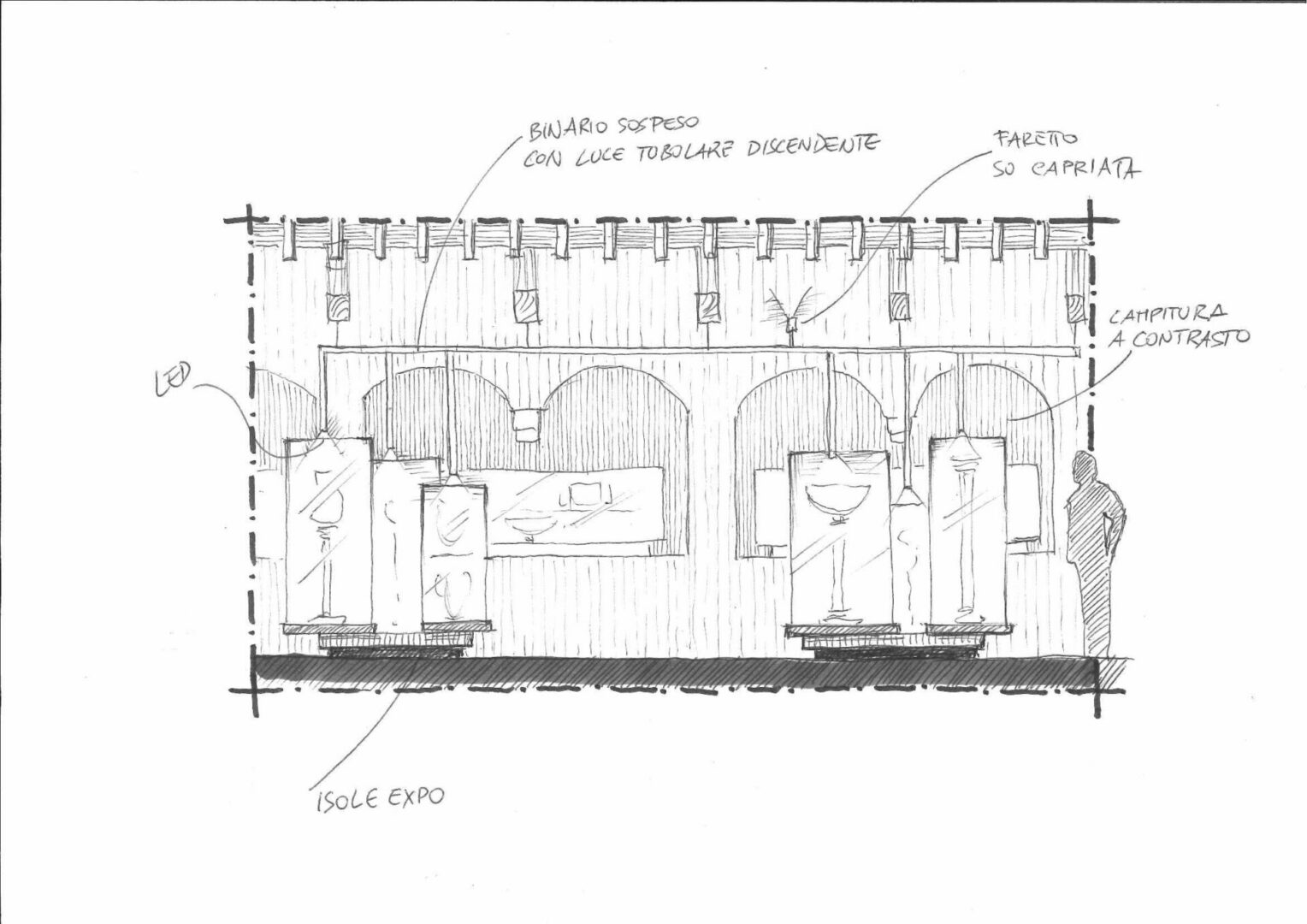 Il concept muove dalla necessità di apprezzare le opere con una visione a 360 gradi. La metafora è quella del tornio che aiuta l’artiere a modellare l’opera, ma una volta completata sarà il visitatore che, mosso dall’opera, la osserverà girandole attorno. In una delle due sale viene evocato lo spazio intimista e raccolto della grotta di alabastro. Il vincolo dettato dalla preesistenza di basse arcate in muratura in una delle sala, è stato tradotto in risorsa progettuale attraverso la ripetizione della sua geometria. La ripetizione delle arcate crea uno spazio archetipico, con al suo centro l’elemento più prezioso del suo contenuto, l’alabastro. Nel rapporto d’insieme, per le loro caratteristiche massive, tali opere si illuminano come gemme all’interno della grotta.